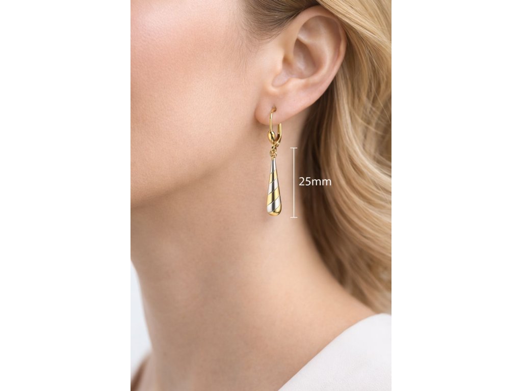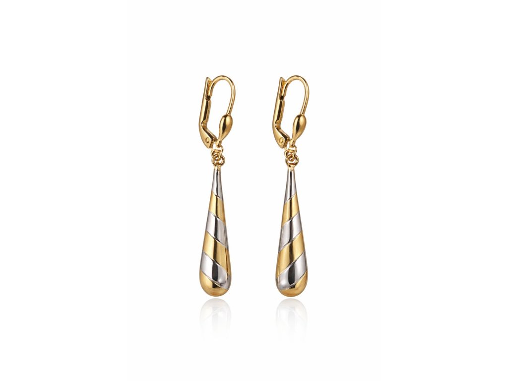 Zlaté visací náušnice z kombinace žlutého a bílého zlata 585/1000 představují elegantní šperk s moderním, nadčasovým vzhledem. Kapkovitý tvar s jemně zkosenými liniemi vytváří zajímavý světelný efekt, díky kterému náušnice krásně vyniknou při nošení.