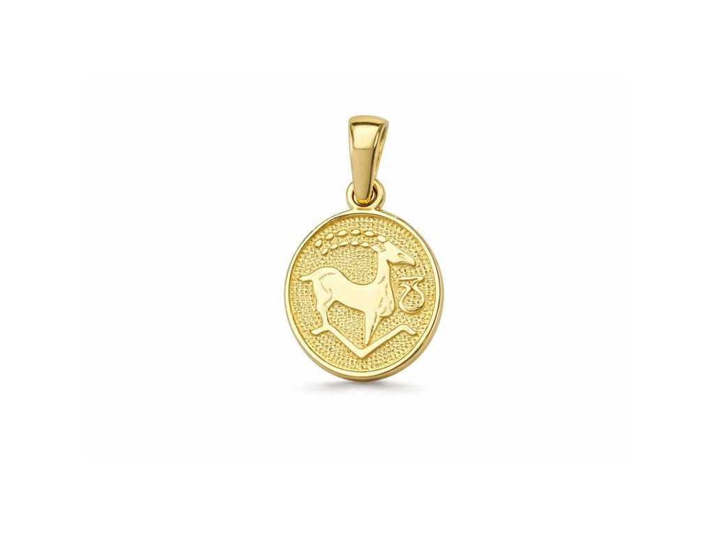 Jemný kulatý přívěšek s motivem znamení Kozoroha je vyroben ze 14kt žlutého zlata. Reliéfní provedení dodává symbolu hloubku a čitelnost, zatímco decentní rozměry zachovávají nenápadný a univerzální vzhled.