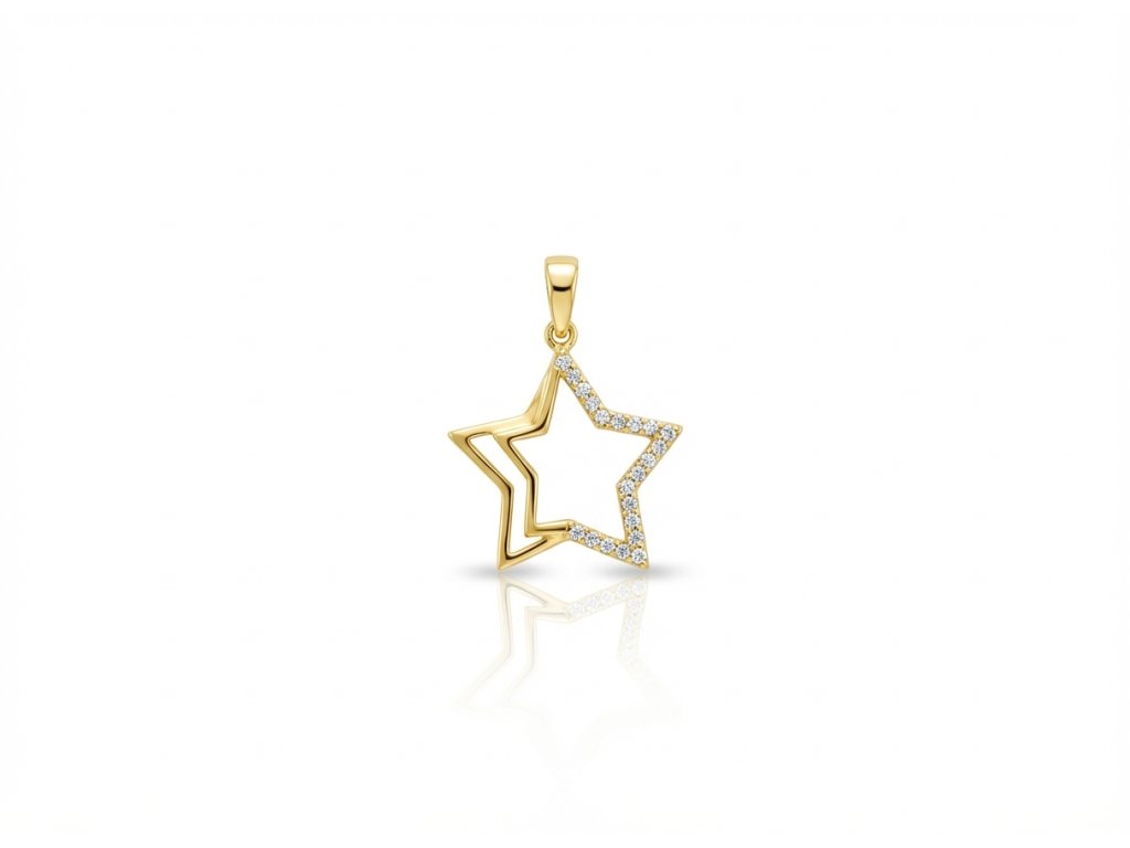 Tento zlatý přívěšek ze zlata 585/1000 ve tvaru hvězdy je symbolem naděje, štěstí a splněných přání. Elegantní otevřený design je doplněn jemnou linií čirých zirkonů, které šperku dodávají luxusní třpyt a lehkost.