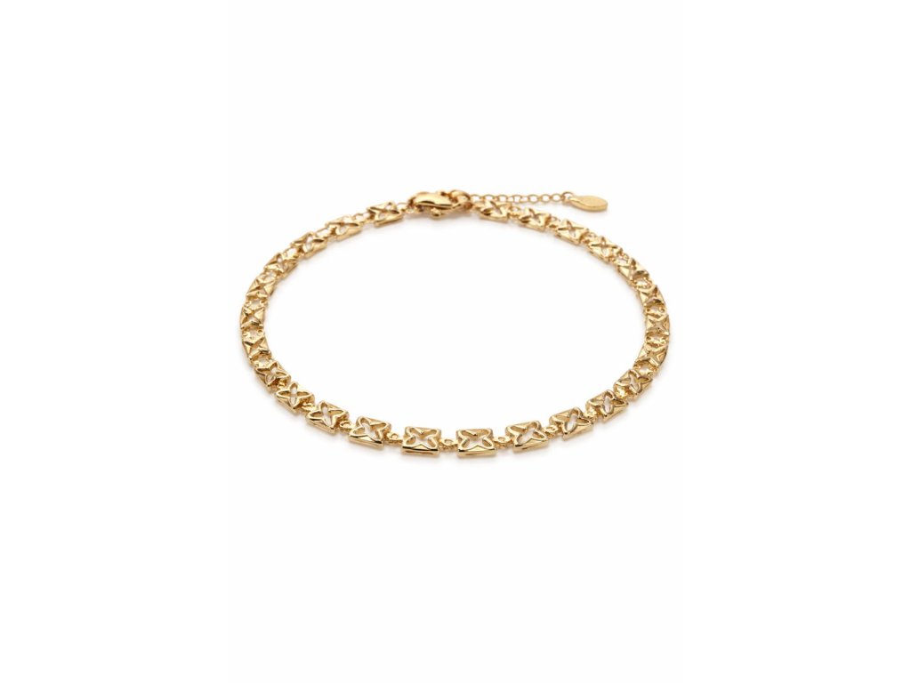 Tento zlatý náramek zaujme přehledným článkovým provedením, kde se jednotlivé prvky plynule propojují do pravidelného rytmu. Květinový motiv dodává šperku osobitý vzhled, aniž by působil výrazně nebo rušivě.