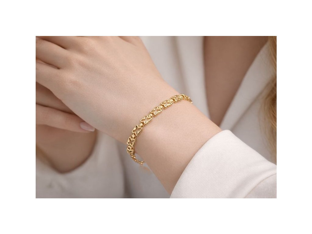Náramek je vyroben ze žlutého zlata 585/1000, které si dlouhodobě zachovává svůj barevný tón i lesk. Díky čistému designu se snadno kombinuje s prsteny, náušnicemi i jemnými řetízky ve stejném odstínu zlata.