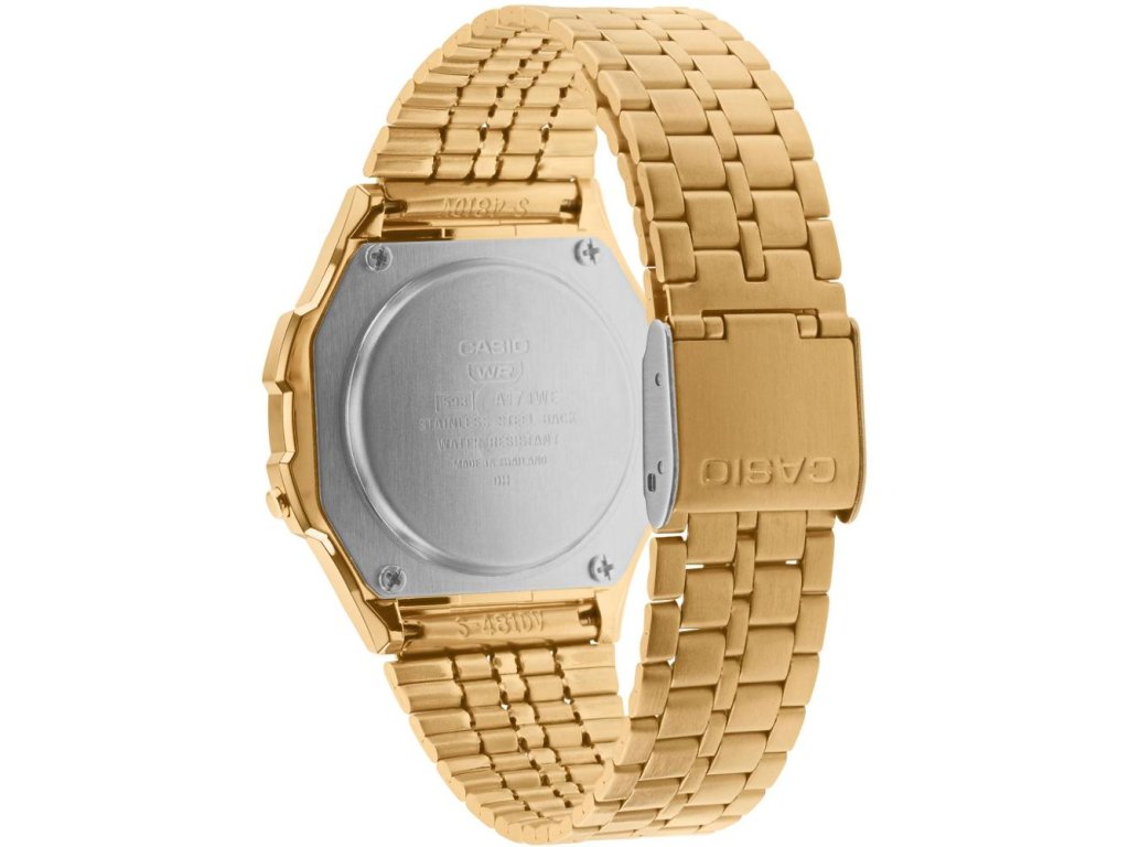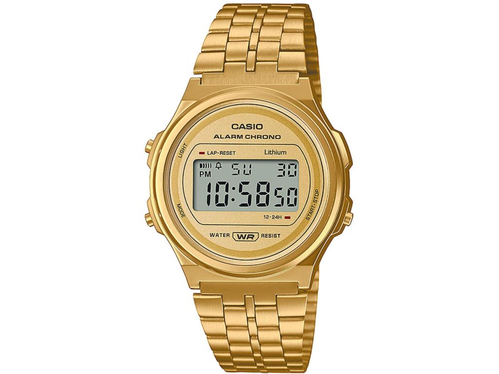 Casio A171WEG-9A zaujmou svým nadčasovým retro designem a zlatou povrchovou úpravou, která je dělá elegantními a zároveň univerzálními pro každodenní nošení. Kulaté plastové pouzdro doplňuje kovový zlatý náramek s nastavitelnou sponou, díky čemuž hodinky pohodlně sedí na zápěstí a snadno se přizpůsobí. Digitální displej jasně ukazuje čas, datum a den v týdnu, a LED podsvícení zajišťuje čitelnost i ve tmě.