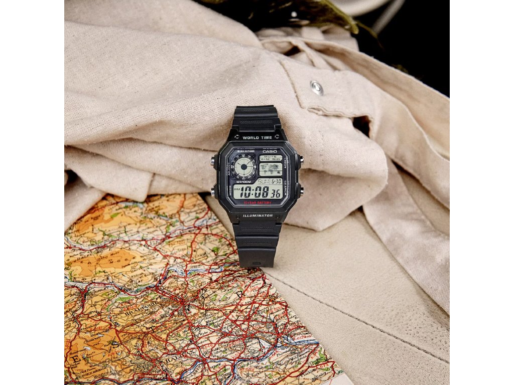 Model nabízí světový čas se zobrazením časových pásem a mapou, stopky s přesností 1/100 sekundy, odpočítávací časovač, denní alarmy, automatický kalendář, volbu 12/24-hodinového formátu a možnost ztlumení zvuků tlačítek. Voděodolnost 100 metrů zajišťuje, že hodinky zvládnou kontakt s vodou — vhodné pro plavání i běžné vodní aktivity. Díky výdrži baterie až 10 let je AE-1200WH-1AV praktickým a spolehlivým společníkem pro každodenní život i cestování.