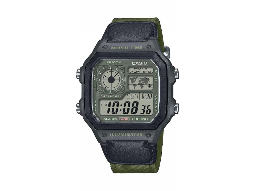 Casio AE-1200WHUB-3AV spojují osvědčený retro-digitální styl s praktickou funkčností — digitální displej přehledně zobrazuje aktuální čas, datum a den v týdnu, zatímco horní segment displeje může trvale ukazovat čas domovského města. Tento model disponuje funkcí světového času, díky níž snadno zjistíte čas ve více časových pásmech — ideální pro cestování nebo komunikaci se zahraničím.