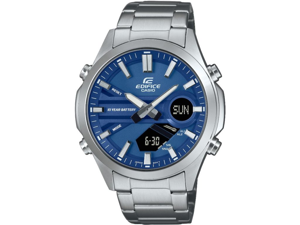 Casio Edifice EFV-C120D-2A spojuje robustní design a širokou paletu funkcí. Kombinace analogového a digitálního zobrazení poskytuje maximální přehlednost i praktičnost. Modrý ciferník doplňuje nerezová ocel, minerální sklíčko chrání proti poškrábání a vodotěsnost do 100 metrů umožňuje nošení i při plavání. Díky 10leté výdrži baterie je tento model ideální pro muže, kteří hledají odolné a spolehlivé hodinky na každý den i cestování.