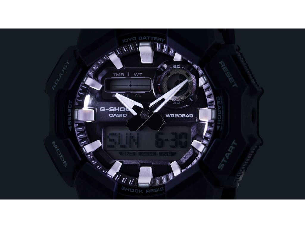 Model GA-010-1A zaujme svým odolným designem s velkým pouzdrem a sportovním vzhledem. Díky konstrukci Carbon Core Guard je lehký, ale zároveň mimořádně odolný. Kombinace analogových ručiček a digitálního displeje přináší přehlednost a univerzálnost. Hodinky jsou skvělou volbou pro sport, outdoor i každodenní nošení a bez problémů zvládnou i náročné prostředí. Díky vodotěsnosti 200 m a odolnosti vůči nárazům patří mezi nejspolehlivější modely v řadě G-Shock.