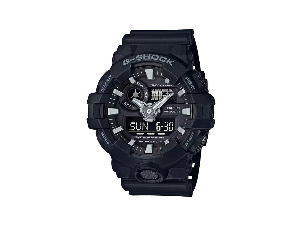 Casio G-Shock GA-700-1B je model, který zaujme od prvního pohledu. Velké pouzdro, silné ručky, výrazné 3D prvky ciferníku a dominující přední tlačítko osvětlení – to vše dává hodinkám charakter určité síly. Kombinace digitálního a analogového zobrazení nabízí jak klasický vzhled, tak moderní funkce. Odolná konstrukce chrání proti nárazům, vodotěsnost 200 m zvládne vodní radovánky i každodenní výzvy, a LED podsvícení zajišťuje skvělou čitelnost i ve tmě.