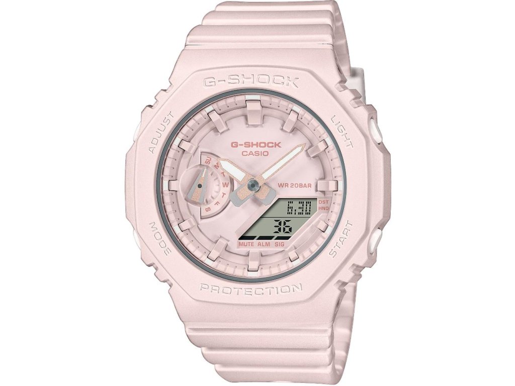 Model GMA-S2100BA-4AER přináší kombinaci výrazného barevného provedení a osvědčené odolnosti řady 2100. Růžový ciferník s růžovo-zlatými ručkami a indexy přidává útulný glamour efekt, který nevypadá jen jako módní doplněk, ale jako silný trendový výběr. Díky konstrukci Carbon Core Guard a pryskyřičnému pouzdru hodinky odolají nárazům a zachovávají nízkou hmotnost. Minerální sklíčko chrání ciferník, vodotěsnost 200 metrů dává možnost plavání i sprchování bez obav. Funkce jako stopky, časovač, světový čas a více alarmů činí hodinky víc než jen ozdobu – jsou to spolehliví pomocníci.