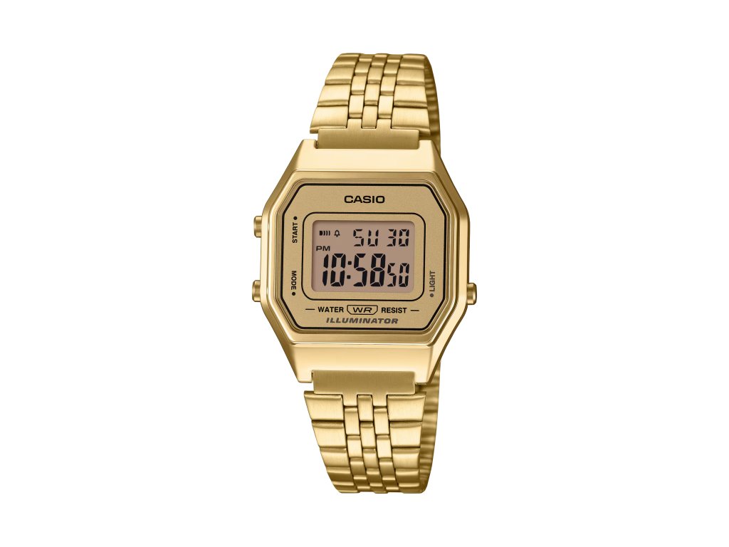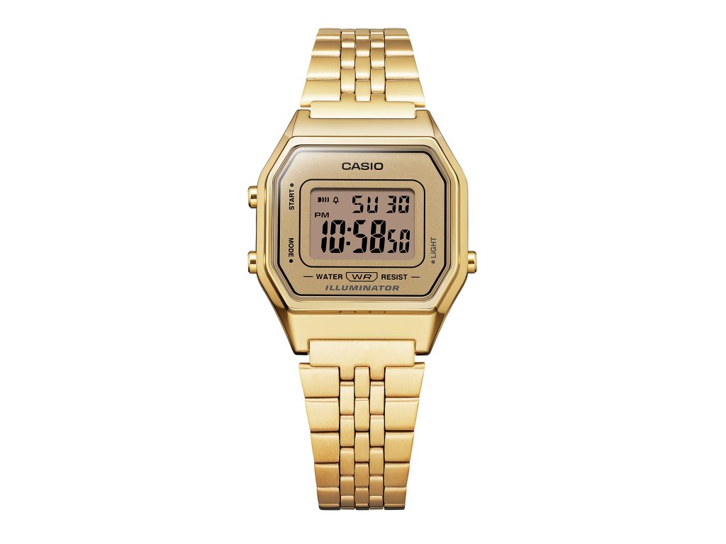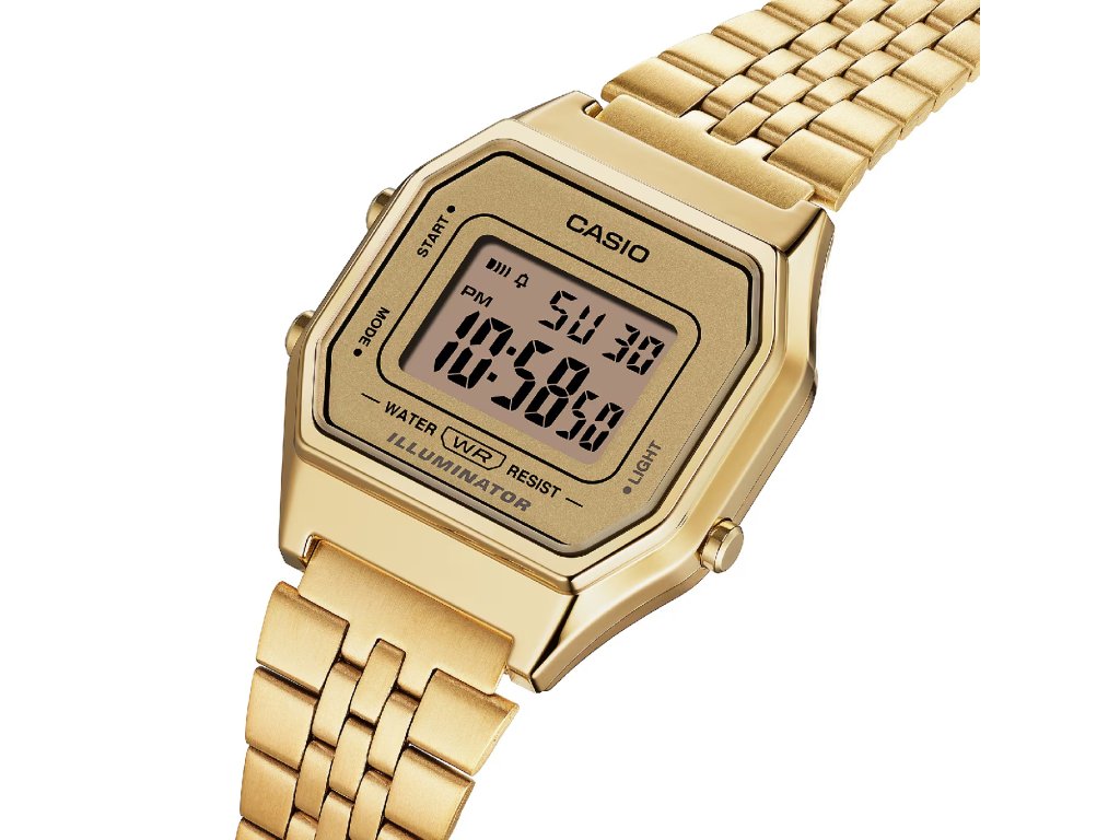 Casio Vintage LA680WEGA-9 spojuje ikonický retro vzhled se spolehlivými funkcemi v kompaktním a lehkém provedení. Zlatý povrch přidává luxusní nádech, nerezový pás a minerální sklíčko chrání před běžným opotřebením. Hodinky jsou ideální pro ty, kdo chtějí nenápadný módní doplněk, který zvládne denní rutinu – LED osvětlení umožní čtení času ve tmě, stopky + alarm pak přidávají praktickou hodnotu.
