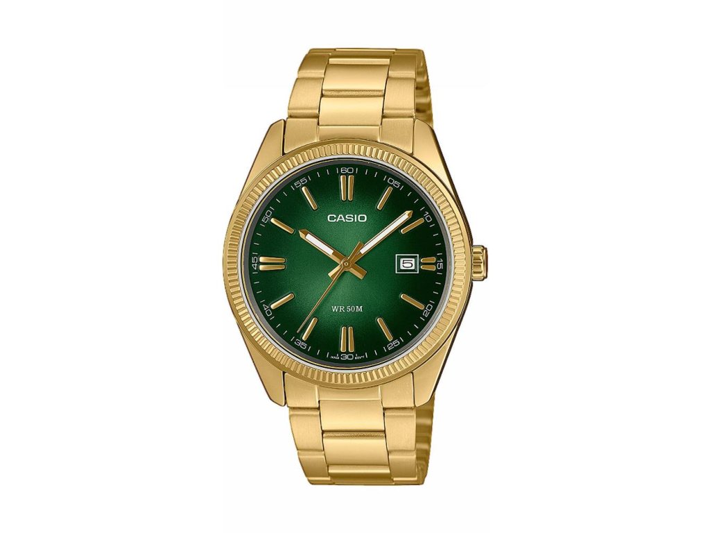 Pánské hodinky Casio MTP-1302PGC-3AV představují ideální spojení klasického stylu a kvalitního zpracování. Jejich elegantní vzhled tvoří pouzdro a náramek z nerezové oceli s iontovou úpravou ve zlatém tónu a zelený číselník s jemným paprskovým efektem, který dodává hodinkám originální charakter.