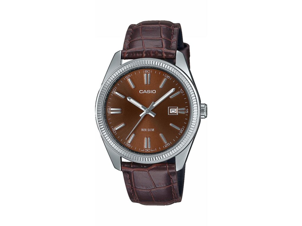 Casio MTP-1302PL-5AV vynikají svým nadčasovým, jednoduchým a stylovým designem. Stříbrné pouzdro s kulatým ciferníkem a hnědým koženým páskem vytváří elegantní a univerzální vzhled, který sluší ke každodenním outfitům i k formálnímu oblečení. Ciferník je přehledný — ručičky a indexy umožňují snadné odečítání času, a datum je zobrazováno v malém okénku na pozici třetí hodiny.