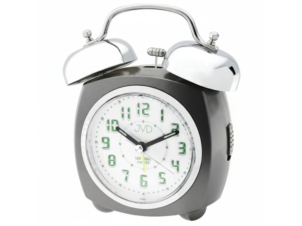 Robustní rozměry 115 × 134 × 67 mm a stříbrné kovové zvonky dodávají budíku charakter a z něj dělají výrazný doplněk ložnice.