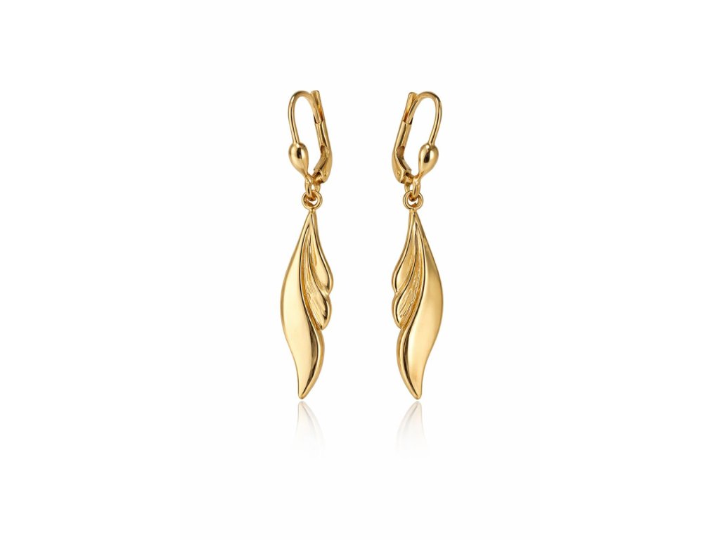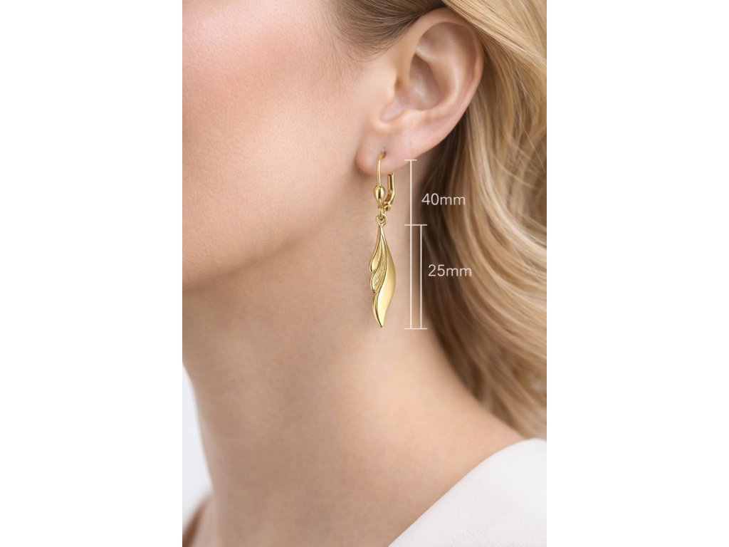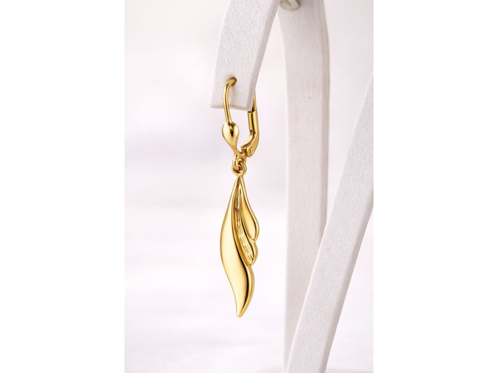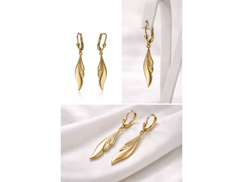 Zlaté visací náušnice vyrobené ze žlutého zlata 585/1000 představují elegantní šperk s nadčasovým designem inspirovaným přírodním motivem lístků. Precizní zpracování a jemné linie dodávají náušnicím lehkost a sofistikovaný vzhled, který se snadno kombinuje s dalšími zlatými doplňky.