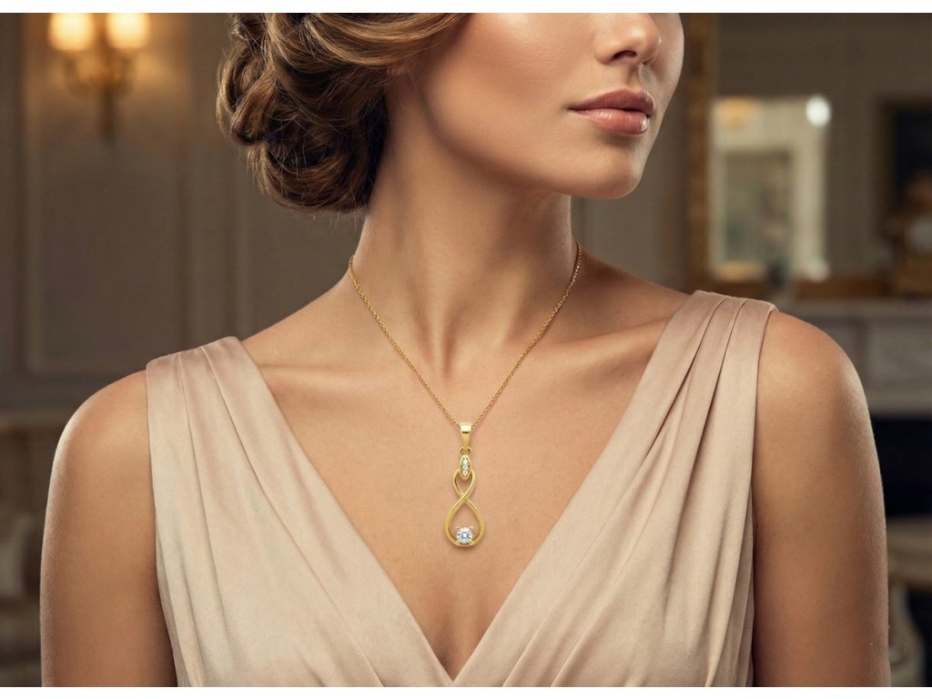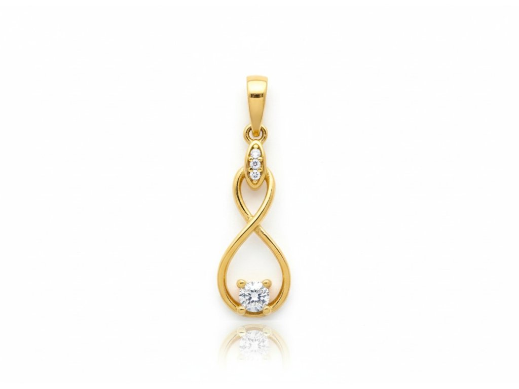 Elegantní zlatý přívěsek ze zlata je jemný a decentní šperk, který krásně doplní každodenní outfit i slavnostní vzhled. Prodloužený tvar s jemně propletenou linií působí lehce, moderně a přirozeně zvýrazňuje linii krku. Na spodní části je zasazen zářivý zirkon, který dodává přívěsku jiskru a podtrhuje jeho nadčasovou eleganci.